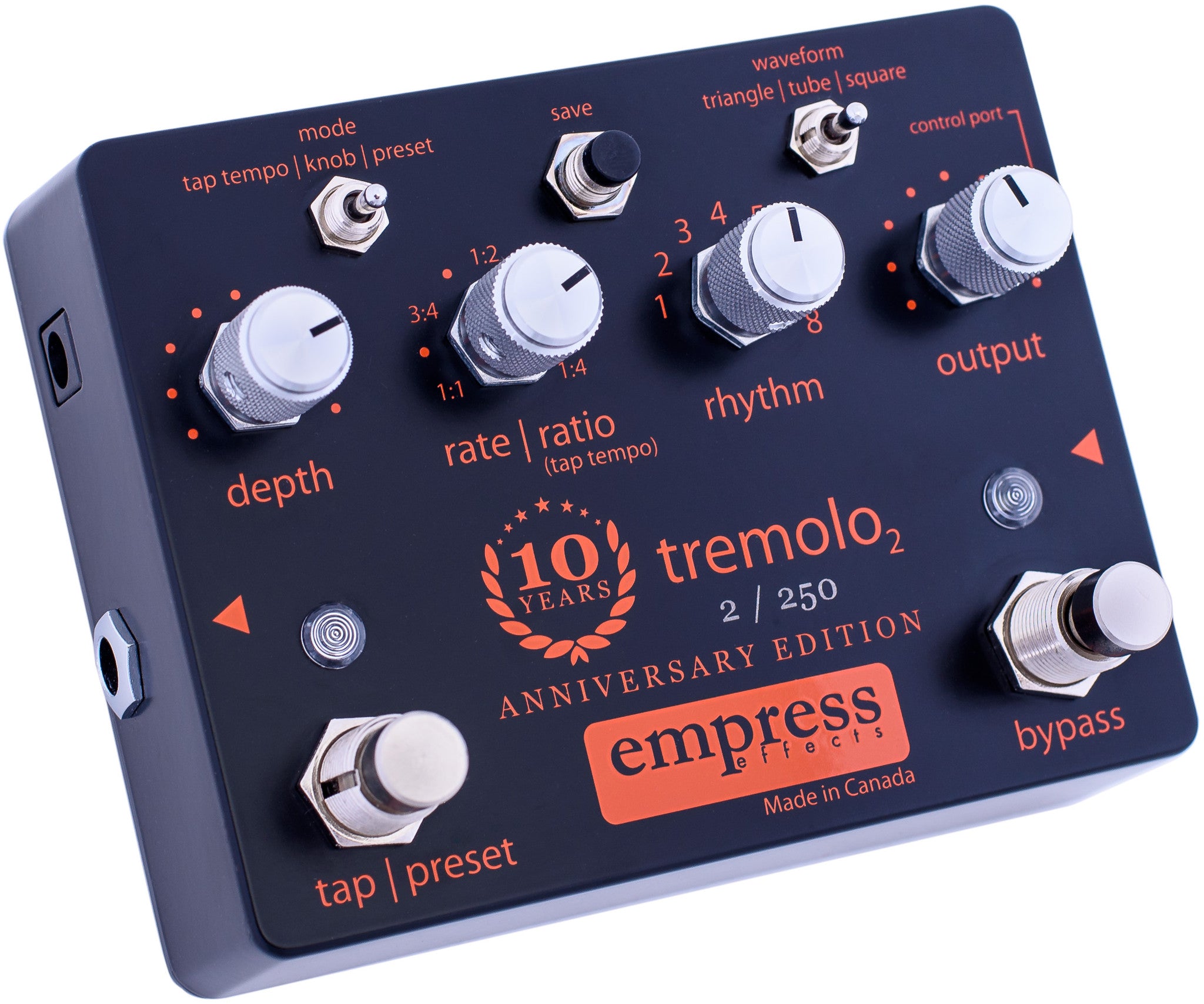 - Tap Tempo - The Empress Tap Tremolo2 Pedal averages your last four taps so it plays in sync with your music. You can also choose different tap to tremolo rate ratios. 1:1, 3:4, 1:2, 1:3, and 1:4 are available.